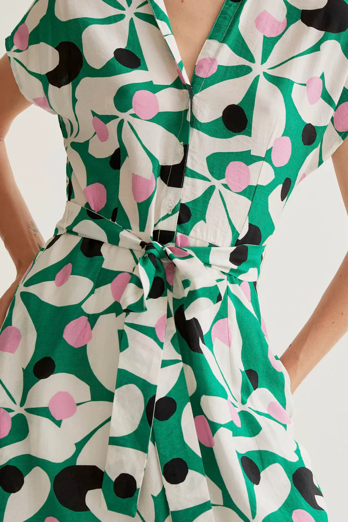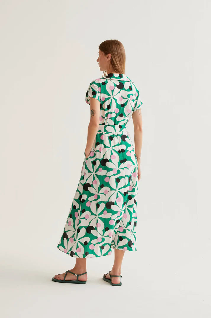 Abito lungo in tessuto crepé leggero con stampa hosta. Collo con risvolo e scollo a V. Manica corta. Chiusura frontale con bottoni bianchi. Vita allacciata. Tasche laterali.Fodera interna. La modella è alta 177 cm e indossa la taglia S.
