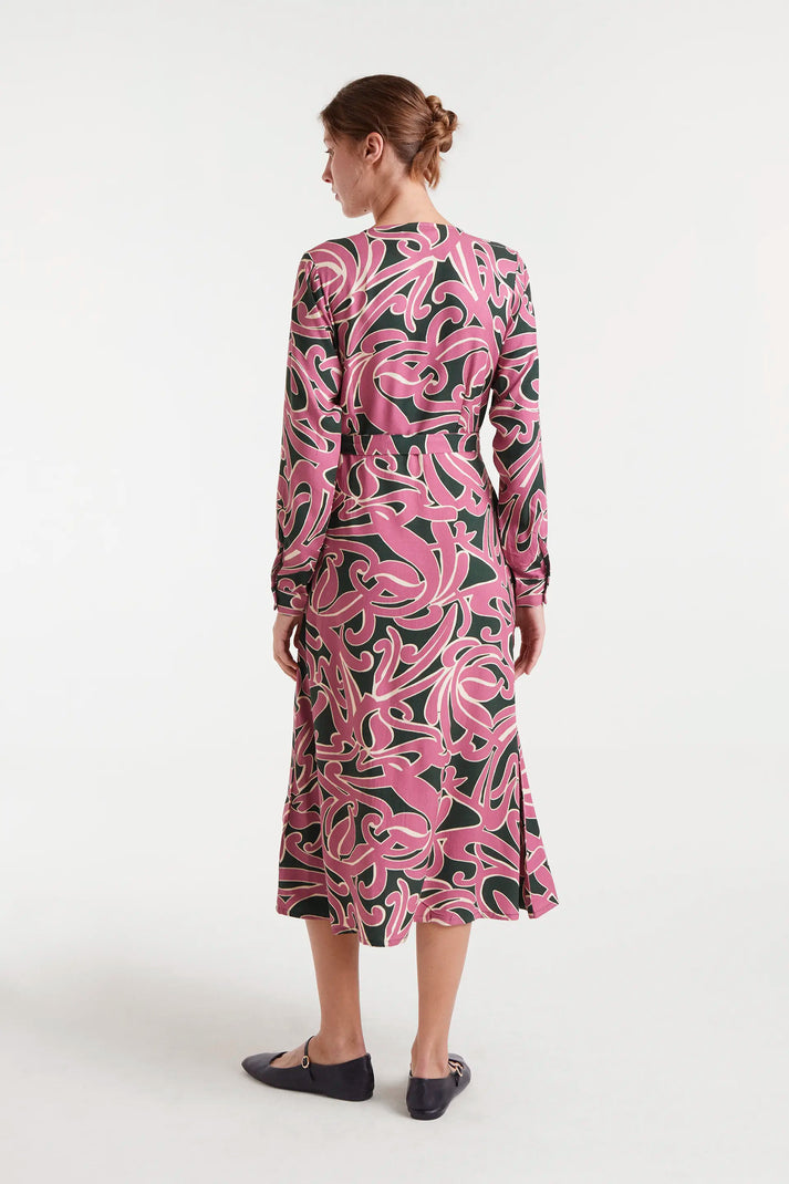 Abito midi con stampa Pastures. Scollo a V e maniche lunghe rifinite con polsino con bottone. Chiusura frontale con bottoni e vita allacciata. La modella è alta 177 cm e indossa la taglia S.