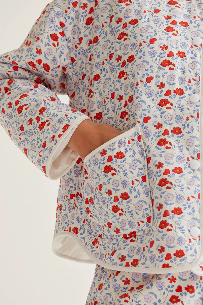 Giacca in tessuto crepé leggero con stampa cute. Girocollo e maniche lunghe. Chiusura frontale con bottoni a pressione bianchi. Tasche laterali. Fodera interna. La modella è alta 177 cm e indossa la taglia S