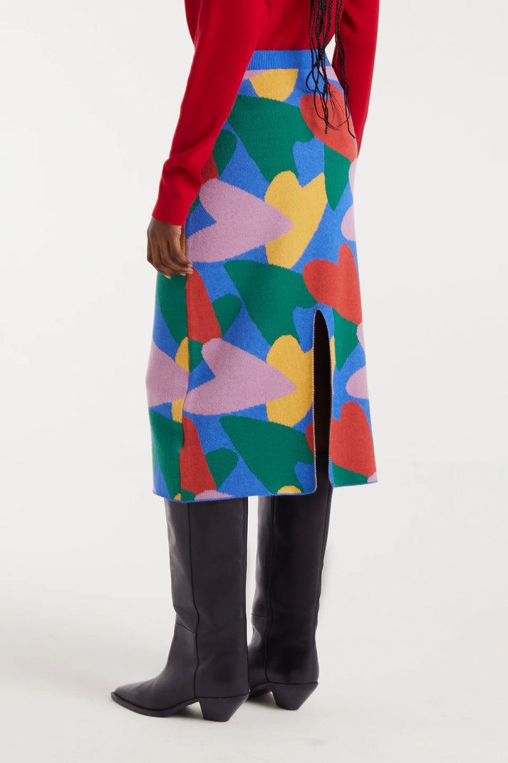 Gonna midi in maglia con stampa cupida. Con elastico in vita e vita media. Dettaglio apertura sul retro. La modella è alta 178 cm e indossa la taglia S.