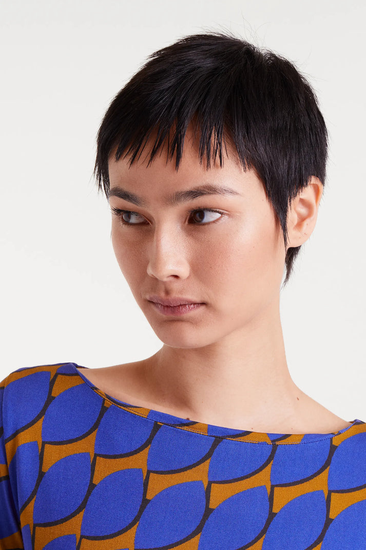 T-shirt con stampa Skouros Small. Tessuto jersey viscoso. Collo a barca e manica lunga. La modella è alta 177 cm e indossa la taglia S.